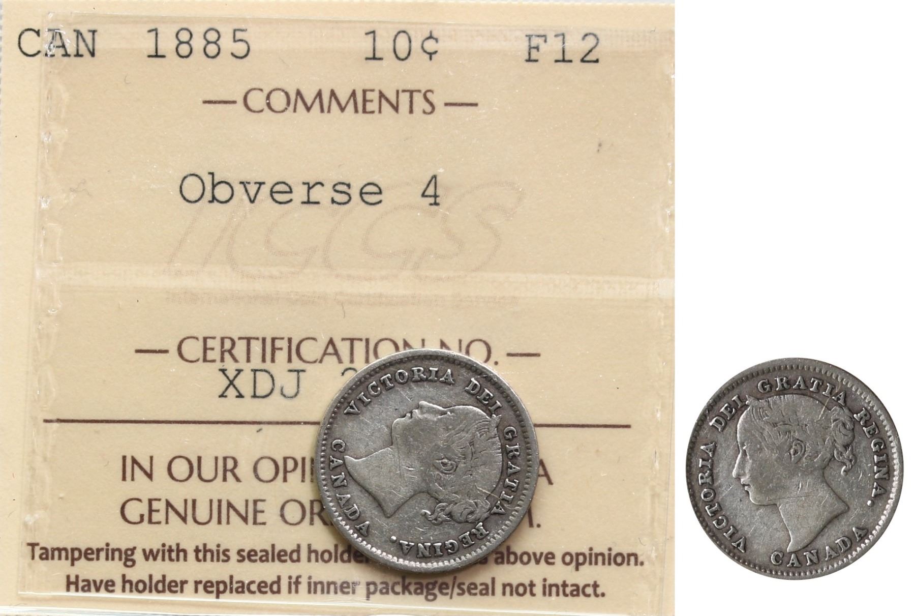 1885 10¢ "Obv.4" ICCS Fine-12 Nice and problem free example.