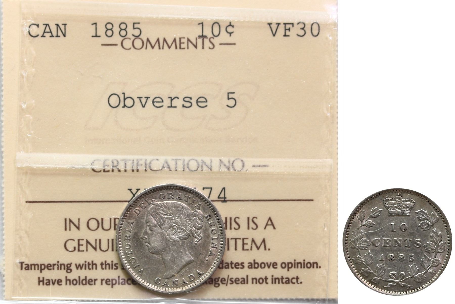 1885 10¢ "Obv.5" PCGS Choice Very Fine-30 Brilliant and lustrous.