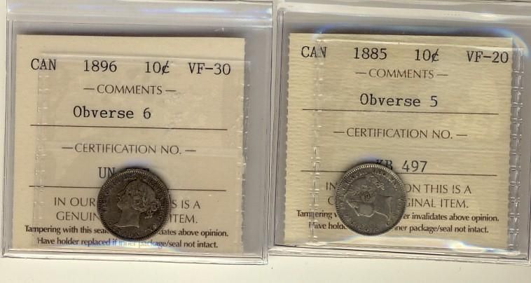 1885 10¢ Obv 5 VF20 & 1896 Obv 6 VF30. Lot of 2 ICCS graded coins.