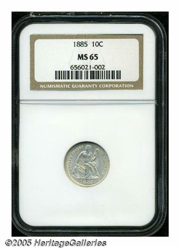 1885 10C MS65 NGC. Impeccable, satiny white surfa