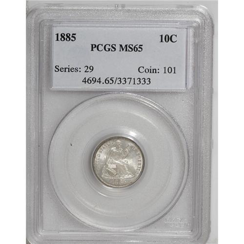 <B>1885<10C> MS65 PCGS.</B></I> A pleasing Gem, sharply struck with excellent satiny luster. This coin is kept from an even higher grade by a few thin marks in the largely-untoned fields.