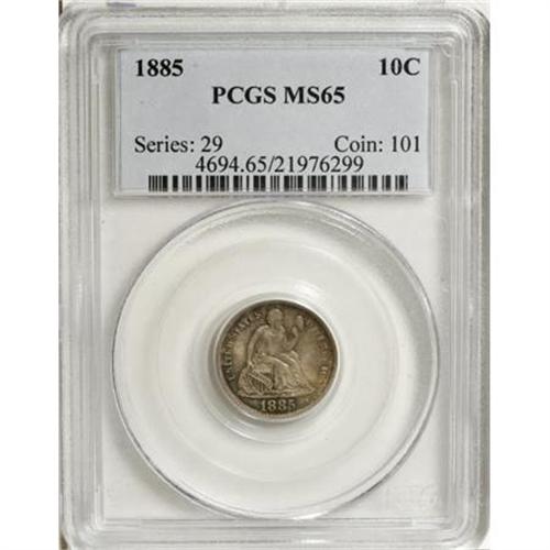 <B>1885 10C MS65 PCGS.</B></I> This satiny Gem is well struck with luminous green-gold and lavender shades that drape the surfaces. Carefully preserved, as demanded of the grade, and a great example of this later Seated dime issue. Population: 39 in 65, 28 finer (8/07).<B><BR></B></I><I>From The Beau Clerc Collection.</B></I><BR><BR><B>Coin Engraver:</B> Christian Gobrecht<BR><BR><b>Shipping:</b> Coins & Currency (<a target="_blank" href="http://www.heritageauctions.com/common/shipping.php">view shipping information</a>)