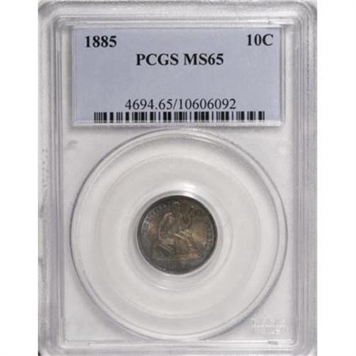 <B>1885 10C MS65 PCGS.</B></I> Rich rose, gold-orange, and violet shadings drape the softly lustrous surfaces of this well struck Gem. Beautifully preserved and a delightful coin for the type collector. Population: 39 in 65, 29 finer (1/08).<BR><BR><B>Coin Engraver:</B> Christian Gobrecht<BR><BR><b>Shipping:</b> Coins & Currency (<a target="_blank" href="http://www.heritageauctions.com/common/shipping.php">view shipping information</a>)