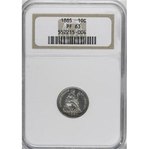 <B>1885 10C PR63 NGC.</B></I> NGC Census: (38/129). PCGS Population (40/161). Mintage: 930. Numismedia Wsl. Price for NGC/PCGS coin in PR63: $354. (#4782)<BR><BR><B>Coin Engraver:</B> Christian Gobrecht<BR><BR><b>Shipping:</b> Coins & Currency (<a target="_blank" href="http://www.heritageauctions.com/common/shipping.php">view shipping information</a>)