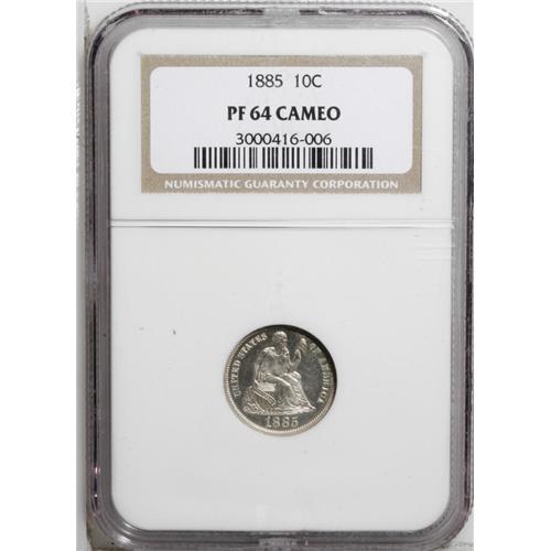 <B>1885<10C> PR64 Cameo NGC.</B></I> Choice and largely untoned with a touch of golden patina in the right reverse field. Deeply reflective with strong contrast, though light hairlines are evident on the obverse. Census: 7 in 64 Cameo, 40 finer (9/06).