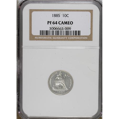 <B>1885 10C PR64 Cameo NGC.</B></I> Though the 930 specimens struck was not the highest mintage for a Seated proof dime, no later issue from that design would have a higher production. A handful of contact marks below ONE DIME on the reverse hardly diminishes the eye appeal of the obverse, which has richly frosted, solidly struck devices against gleaming, practically untoned surfaces. Census: 8 in 64 Cameo, 43 finer (4/07).<BR><BR><b>Shipping:</b> Coins & Currency (<a target="_blank" href="http://www.heritageauctions.com/common/shipping.php">view shipping information</a>)
