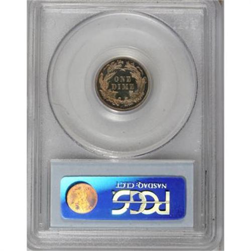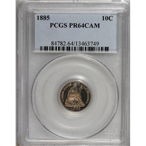 <B>1885 10C PR64 Cameo PCGS.</B></I> Vibrant champagne patina with orange and rose tints graces the shining surfaces of this Choice specimen. The moderately frosted devices of this late-date piece contrast strongly with the fields despite a layer of toning. Population: 13 in 64 Cameo, 27 finer (8/07).<BR><BR><b>Shipping:</b> Coins & Currency (<a target="_blank" href="http://www.heritageauctions.com/common/shipping.php">view shipping information</a>)