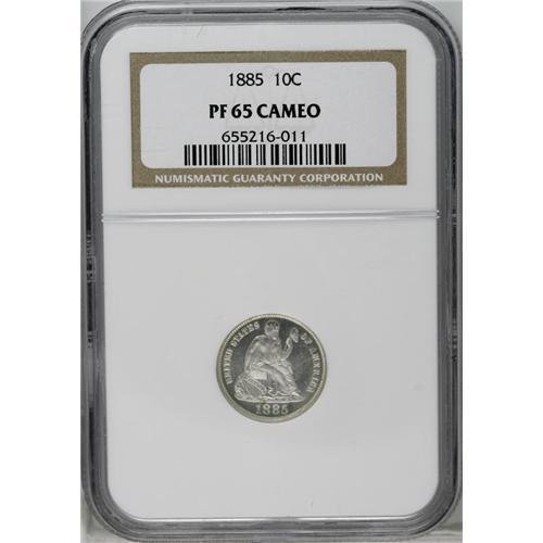 <B>1885<10C> PR65 Cameo NGC.</B></I> Satinlike cameo devices and deeply reflective mirrored fields create a stunning visual effect. The surfaces of this Gem proof example are fully brilliant. Just 930 proof examples of this issue were struck, and few remain as nice as this specimen.