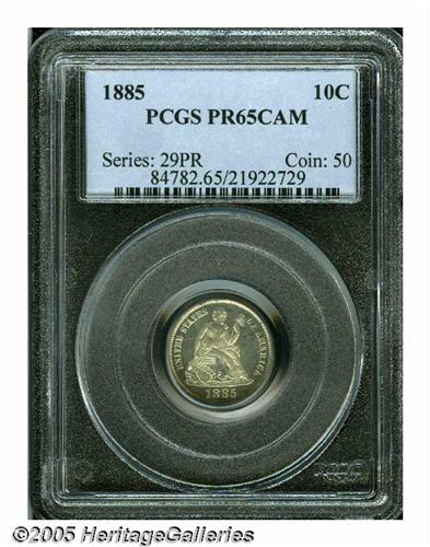 <B>1885<10C> PR65 Cameo PCGS.</B></I> Moderate frosting on the devices reflects against the mirrored fields. A light amount of golden-brown patina deepens slightly toward the border areas. Sharply struck throughout, save for slight softness on Liberty's head, and no mentionable contact marks. Just 930 proofs were struck.