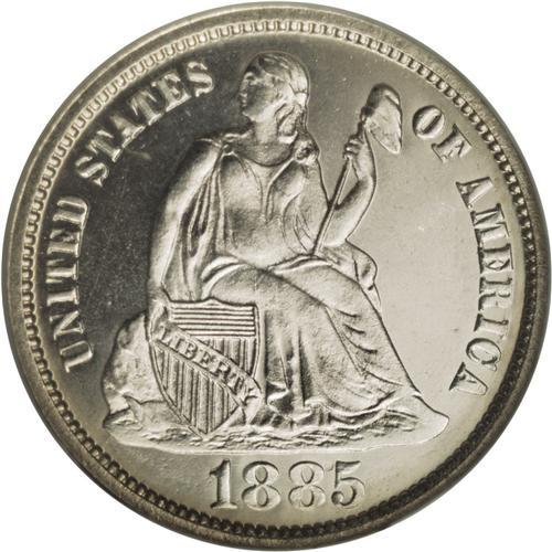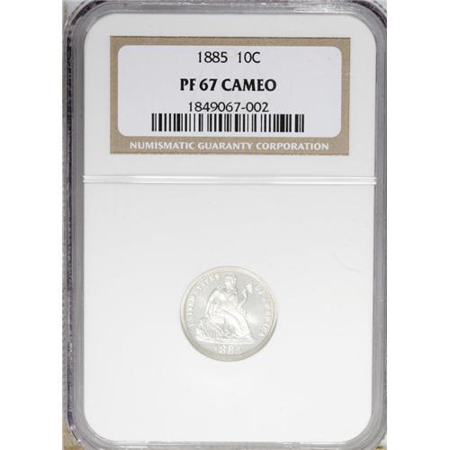 <B>1885 10C PR67 Cameo NGC.</B></I> Heavily frosted devices stand out against mirrored fields, and the crisp delineation on all of the design elements further enhances the cameo contrast. Nearly untoned, except for a whisper of incipient gold color along the peripheries. Close examination reveals no mentionable marks. Census: 20 in 67 Cameo, 3 finer (3/07).<BR><BR><b>Shipping:</b> Coins & Currency (<a target="_blank" href="http://www.heritageauctions.com/common/shipping.php">view shipping information</a>)
