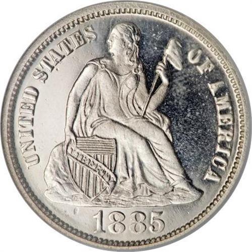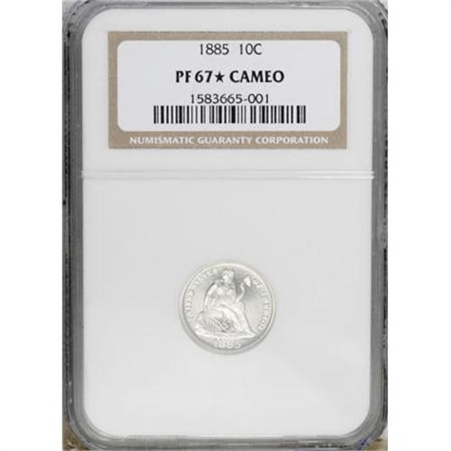 <B>1885 10C PR67 Cameo <img src="/images/star.gif" width="10" height="10" alt="" border="0"> NGC.</B></I> This Superb Gem proof with its remarkable Cameo appearance is an amazing piece that will surely delight the connoisseur. Both sides have full contrast between the fields and devices, and no evidence of toning is present on either side. Census: 1 in 67 <B><img src="/images/star.gif" width="10" height="10" alt="" border="0"></B></I> Cameo, 3 finer (10/07).<BR><BR><b>Shipping:</b> Coins & Currency (<a target="_blank" href="http://www.heritageauctions.com/common/shipping.php">view shipping information</a>)