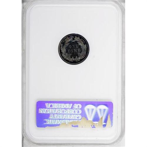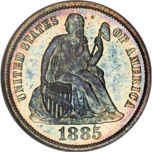 <B>1885 10C PR67 NGC. CAC.</B></I> A coin for enthusiasts of gorgeous original color, this piece offers pastel rings of rose, saffron, turquoise, and jade, over undisturbed, trouble-free surfaces that sing with luster. Considerable cameo contract only enhances the already enormous appeal. Perhaps exceeded numerically, but not aesthetically. Census: 11 in 67, 3 finer (3/08).<BR><I>From The Good Humor Collection.</B></I><BR><BR><B>Coin Engraver:</B> Christian Gobrecht<BR><BR><b>Shipping:</b> Coins & Currency (<a target="_blank" href="http://www.heritageauctions.com/common/shipping.php">view shipping information</a>)