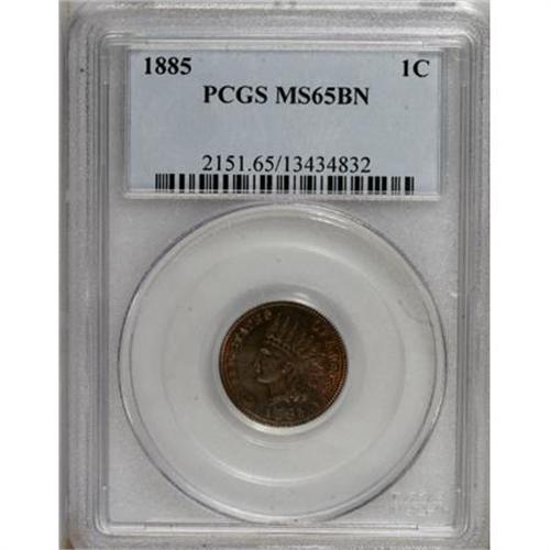 <B>1885 1C MS65 Brown PCGS.</B></I> PCGS Population (10/1). NGC Census: (51/14). Mintage: 11,765,384. Numismedia Wsl. Price for NGC/PCGS coin in MS65: $350. (#2151)<BR><BR><B>Coin Engraver:</B> James B. Longacre<BR><BR><b>Shipping:</b> Coins & Currency (<a target="_blank" href="http://www.heritageauctions.com/common/shipping.php">view shipping information</a>)