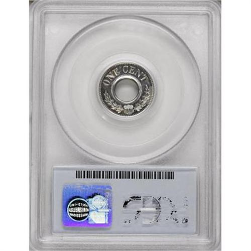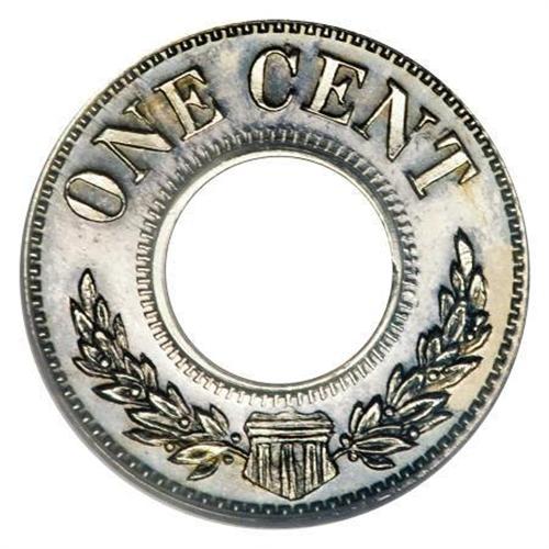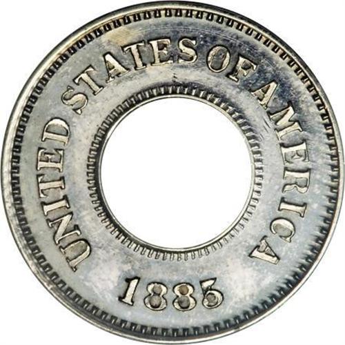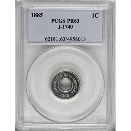 <B>1885 1C One Cent, Judd-1740, Pollock-1950, High R.6, PR63 PCGS.</B></I> This annular pattern cent has a central perforation with a smooth, raised edge. The obverse has UNITED STATES OF AMERICA above with the date 1885/3 at the bottom of that side. On the reverse, ONE CENT is in large letters at the top with a small shield below flanked by laurel sprigs. Struck in silver with a plain edge. This precisely struck and glossy olive and cream-gray example has a couple of tiny obverse ticks, but is generally smooth.<BR><I>From The Madison Collection.</B></I><BR><BR><b>Shipping:</b> Coins & Currency (<a target="_blank" href="http://www.heritageauctions.com/common/shipping.php">view shipping information</a>)