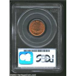 1885 1C MS65 Red PCGS. Ex: Newcomb. Formerly offered in our New York Signature Sale, where it was described as, "Splendid orange-red and lilac surfaces are boldly struck and, except for a small area of discoloration in the lower left obverse field, appear essentially as struck." Population: 32 in 65, 9 finer (9/02). Important notice: We expect to be auctioning lots at the rate of 200-250 per hour. Sometimes eBay Premier live bid software cannot keep up with that pace, so we strongly recommend that you place a realistic proxy bid now as insurance to avoid disappointment. Also please note that all Heritage/CAA lots purchased through eBay Premier carry a 20% Buyer's Premium. Please make sure you read the Terms and Conditions.