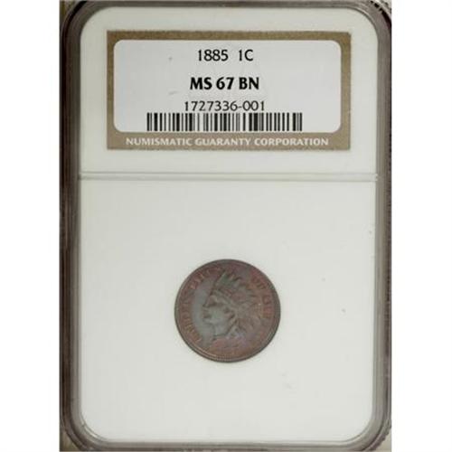 <B>1885 1C MS67 Brown NGC.</B></I> This is only one of two MS67 Brown examples of this date certified by either grading service. A boldly struck Superb Gem, with highly lustrous, seemingly pristine surfaces. Although designated as Brown, vibrant orange-red iridescence is prominently seen on both sides, mostly near the borders. A fabulous coin. <BR><BR><B>Coin Engraver:</B> James B. Longacre<BR><BR><b>Shipping:</b> Coins & Currency (<a target="_blank" href="http://www.heritageauctions.com/common/shipping.php">view shipping information</a>)