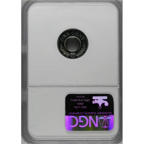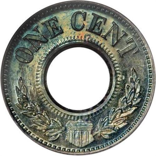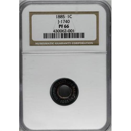 <B>1885 1C One Cent, Judd-1740, Pollock-1950, High R.6, PR66 NGC.</B></I> This annular (ring-shaped) pattern cent has a central perforation. The obverse has UNITED STATES OF AMERICA above with the date 1885/3 at the bottom of that side. On the reverse, ONE CENT is in large letters at the top with a small shield that is flanked by laurel sprigs below. Struck in silver with a plain edge. This is a more polished example of Eastman Johnson's design from 1884. This is a lovely, nearly flawless example that displays deep golden-crimson and thalo-blue toning. An outstanding piece of this historic and important design.<BR><BR><b>Shipping:</b> Coins & Currency (<a target="_blank" href="http://www.heritageauctions.com/common/shipping.php">view shipping information</a>)