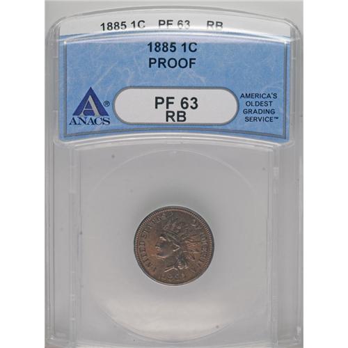 <B>1885 1C PR63 Red and Brown ANACS.</B></I> NGC Census: (4/158). PCGS Population (50/239). Mintage: 3,790. Numismedia Wsl. Price for NGC/PCGS coin in PR63: $180. (#2343)<BR><BR><b>Shipping:</b> Coins & Currency (<a target="_blank" href="http://www.heritageauctions.com/common/shipping.php">view shipping information</a>)