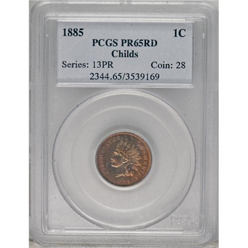 <B>1885 1C PR65 Red PCGS.</B></I> Ex: Childs. Splendid orange and fire-red borders surround the pale straw-gold centers. Well struck save for the date and the top of the shield. The Childs collection once contained the finest certified 1804 dollar. Population: 17 in 65 Red, 11 finer (2/07).<BR><I>Ex: Walter H. Childs Collection (Bowers and Merena, 8/99), lot 60.</B></I><BR><BR><b>Shipping:</b> Coins & Currency (<a target="_blank" href="http://www.heritageauctions.com/common/shipping.php">view shipping information</a>)