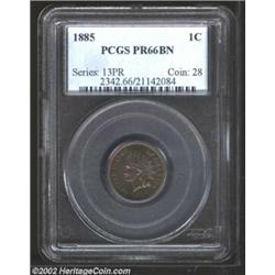 1885 1C PR66 Brown PCGS. The first 8 in the date is lightly repunched within the lower loop. Impressive mauve-violet, gold, and yellow-olive colors appear when the Cent is rotated under a light. An exquisitely struck premium Gem with surfaces that are essentially unimprovable.From the "Newmismatist" Collection. Important notice: We expect to be auctioning lots at the rate of 200-250 per hour. Sometimes eBay Premier live bid software cannot keep up with that pace, so we strongly recommend that you place a realistic proxy bid now as insurance to avoid disappointment. Also please note that all Heritage/CAA lots purchased through eBay Premier carry a 20% Buyer's Premium. Please make sure you read the Terms and Conditions.