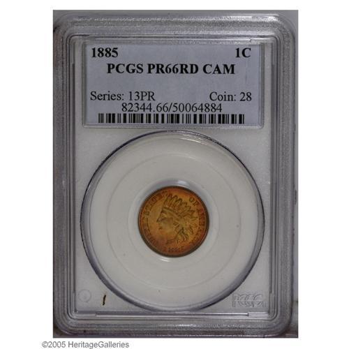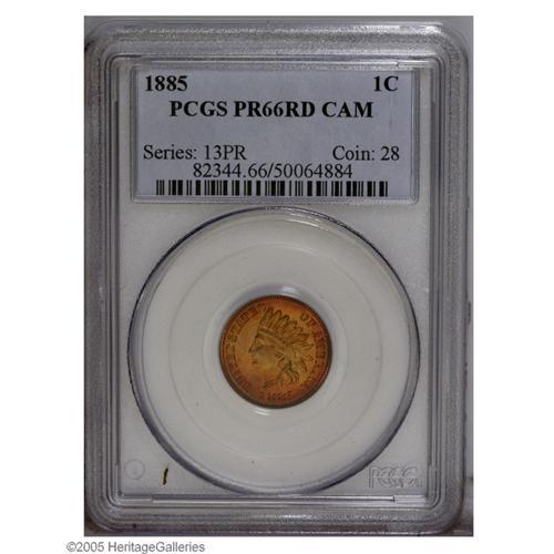 <B>1885<1C> PR66 Red Cameo PCGS.</B></I> While many proof 1885 Cents display unsightly toning streaks from an improperly mixed alloy in the planchet, this high quality Gem is evenly colored in crimson-red luster. Slightly deeper magenta tinged undertones are also evident, along with a razor sharp strike that leaves no feather tip ill-defined. The elusiveness of high grade business strike 1885 Cents adds even more to the desirability of this smooth, virtually pristine proof. Population: 1 in 66 Cameo, none finer (10/05).