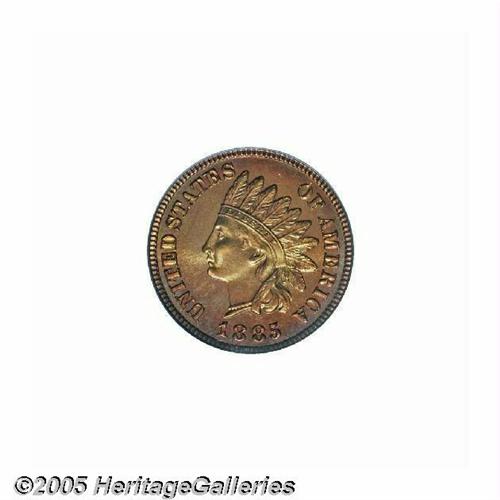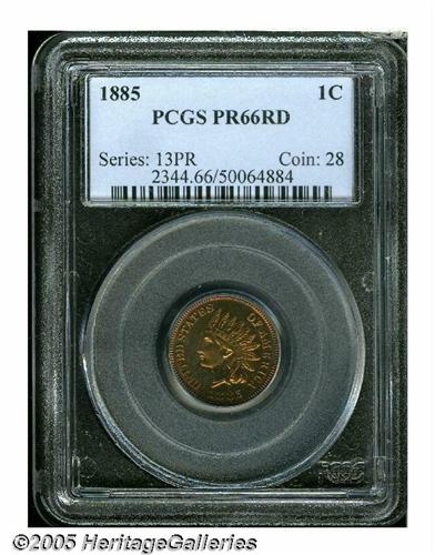 <B>1885<1C> PR66 Red PCGS.</B></I> While many proof 1885 Cents display unsightly toning streaks from an improperly mixed alloy in the planchet, this high quality Gem is evenly colored in crimson-red luster. Slightly deeper magenta tinged undertones are also evident, along with a razor sharp strike that leaves no feather tip ill-defined. The elusiveness of high grade business strike 1885 Cents adds even more to the desirability of this smooth, virtually pristine proof. Population: 9 in 66, 3 finer (6/05).
