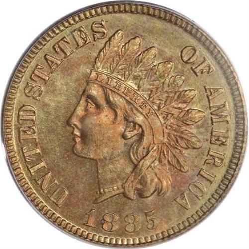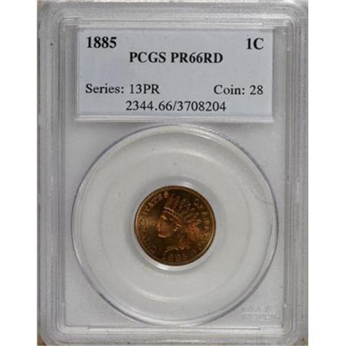<B>1885 1C PR66 Red PCGS.</B></I> Splashes of orange, lime-green, crimson, and gold visit both sides of this Premium Gem Red proof. A well directed strike imparts good definition to the design elements, including the feather tips and the diamonds. There are no significant contact marks or unsightly spots to report. Population: 8 in 66 Red, 3 finer (7/07).<BR><BR><B>Coin Engraver:</B> James B. Longacre<BR><BR><b>Shipping:</b> Coins & Currency (<a target="_blank" href="http://www.heritageauctions.com/common/shipping.php">view shipping information</a>)