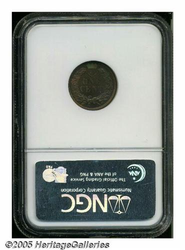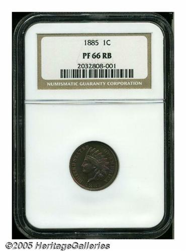 <B>1885<1C> PR66 Red and Brown NGC.</B></I> Vigorously toned in rose, peach, and lime colors. The eye appeal is formidable, which creates an opportunity for the toning connoisseur. A solitary and miniscule spot is above the second headdress feather.