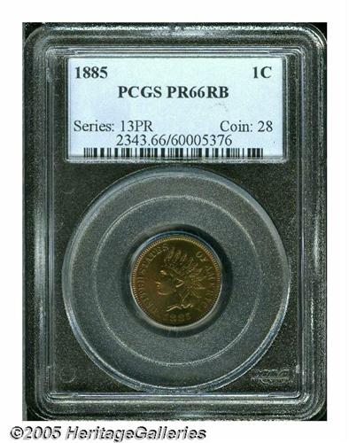 <B>1885<1C> PR66 Red and Brown PCGS.</B></I> One of the more singularly attractive examples of this issue that we have examined. The razor-sharp striking details include fully articulated design elements on each of the two sides. Rich dark-green and golden-red coloration alternates over obverse and reverse. The highly reflective proof surfaces seem pristine. Population: 29 in 66 Red and Brown, 14 finer in Red and Brown (6/05).<BR><I>From The Melrose Bay Collection.</B></I>