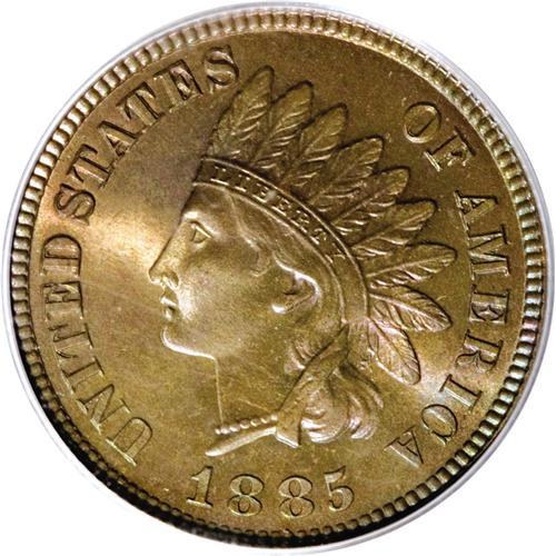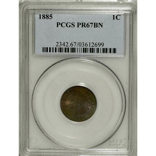 <B>1885 1C PR67 Brown PCGS.</B></I> Both sides of this extraordinary Gem have lost virtually all signs of mint red, but have been replaced by colorful lime-green and rose iridescence. Save for a few tiny flecks of carbon, the modestly reflective surfaces are essentially as struck. Population: 8 in 67, 0 finer (3/07).<BR><BR><b>Shipping:</b> Coins & Currency (<a target="_blank" href="http://www.heritageauctions.com/common/shipping.php">view shipping information</a>)