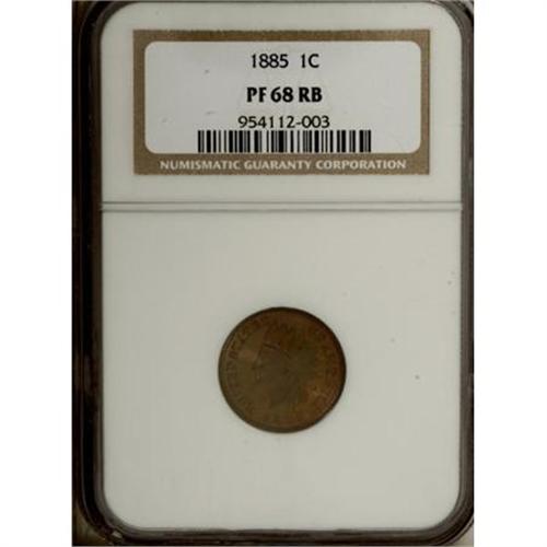 <B>1885 1C PR68 Red and Brown NGC.</B></I> A spectacular, deeply mirrored proof that exhibits delightful field-motif contrast when the coin is tilted just slightly under a light source. Richard Snow, in his Flying Eagle and Indian Head Cents guide book notes that: "It is very difficult to find full red examples, and examples with deep cameo contrast are very tough to find." This gorgeous piece comes <I>very</B></I> close in both respects! The surfaces are as technically perfect today as they were in 1885. The only difference between then and now is the presence of slight browning on the mostly red surfaces. All of the design elements are crisply impressed, including completeness on all four diamonds and the feather tips. Population: 1 in 68 Red and Brown, 0 finer (11/07).<BR><I>From The New York Eye Appeal Collection, Part Three.</B></I><BR><BR><B>Coin Engraver:</B> James B. Longacre<BR><BR><b>Shipping:</b> Coins & Currency (<a target="_blank" href="http://www.heritageauctions.com/common/shipping.php">view shipping information</a>)