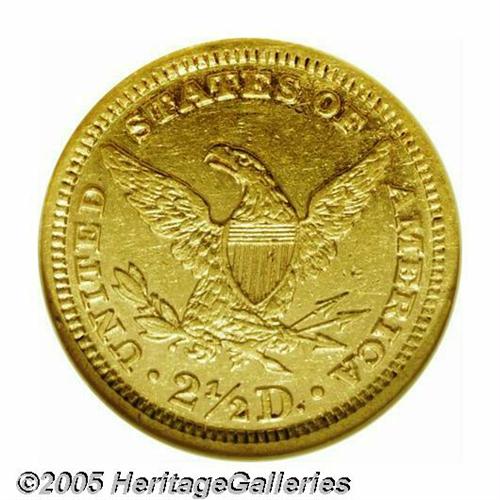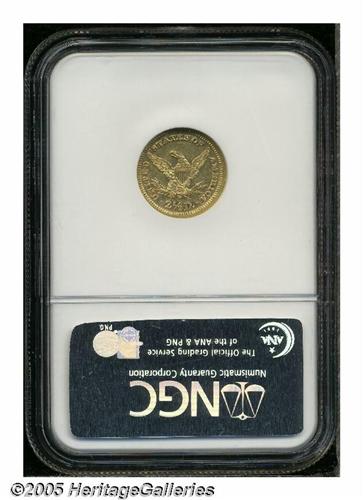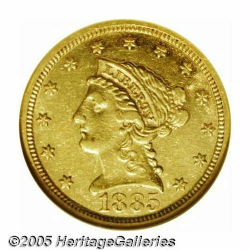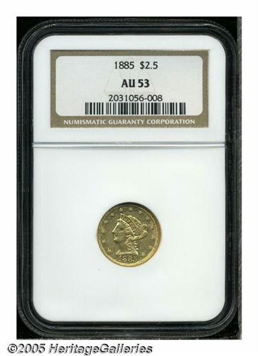 <B>1885<$2 1/2> AU53 NGC.</B></I> It is a very unusual and pleasant opportunity to be able to offer one of the rarest Liberty Quarter Eagles in the entire series. The 1885 has the fourth lowest business strike mintage--800 pieces--of any Liberty Quarter Eagle coin, next to the 1881, the 1875, and the prohibitively rare 1854-S. One theory for the exceedingly low business strike production is that even as late as the 1880s, individuals could come personally and bring their gold to the mint for conversion into coin of the realm. There was a glut of gold coins, particularly in the East, and no production had been specified. Maybe these precious few coins were produced from direct public demand. From this tiny mintage, a total of 99 pieces have been certified by both services in all grades, undoubtedly, some of which are certainly resubmissions. AUs seem to be the median grade for the date, and this specimen hits right in the middle. The strike is sharp and the surfaces still show some prooflike reflectivity. This is truly an opportunity for the astute gold buyer, as this is an exceptional coin that is rarely offered for sale.