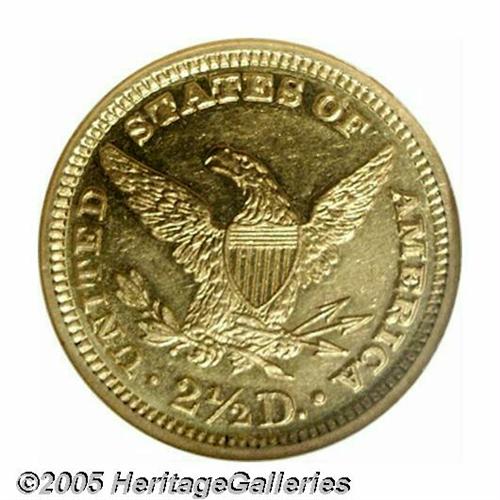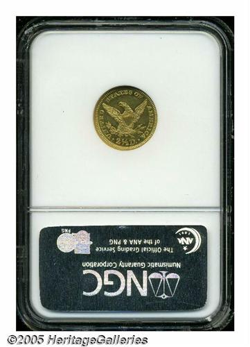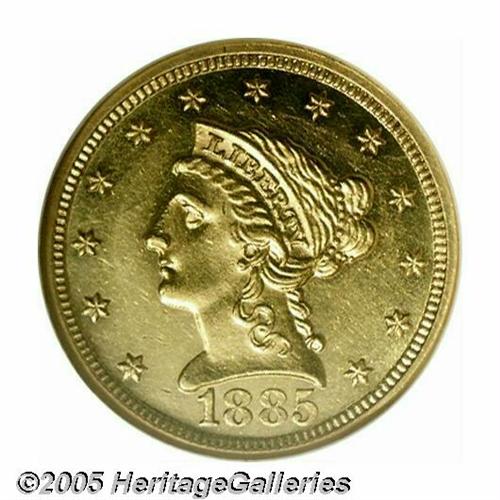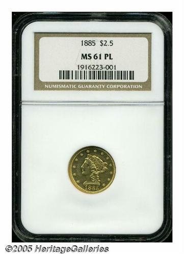 <B>1885<$2 1/2> MS61 Prooflike NGC.</B></I> With a mintage of just 800 business strikes, this issue ranks among the lowest mintage Liberty Quarter Eagles. In fact, this is one of just five issues with less than 1,000 business strike examples produced. The others are 1854-S, 1856-D, 1875, and 1881. This is the only example that NGC has certified as Prooflike, and one of just 20 coins certified by that service as Mint State. This is sharply struck throughout with fully prooflike fields and sharply defined devices. Just the slightest scuffiness is noted, limiting the grade. An extremely important opportunity.