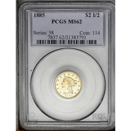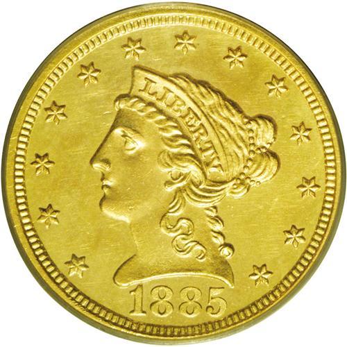 <B>1885<$2 1/2> MS62 PCGS.</B></I> A typically bold and moderately prooflike piece that is kept from a higher Mint State rating by a few wispy slide marks to the right of the portrait. As with all quarter eagle issues from this and the following decade, production was extremely limited. Only 800 business strikes were issued in addition to 87 proofs. Most of the approximately one hundred survivors are in AU grades, which indicates that the bulk of survivors eventually went into non-numismatic hands. Population: 5 in 62, 13 finer (3/06).<BR><I>From The Steve Glenn Collection.</B></I> <BR><BR><B>Important notice:</B> Heritage usually auctions material at the rate of 200-250 lots per hour. On some occasions eBay Live bid software or the Internet may not be able to keep up with the pace of the auction. We recommend placing a realistic absentee bid now as insurance to avoid disappointment. Occasionally the auctioneer may eliminate or reject an eBay Live bid, and the auctioneer may also reopen a lot after the close of the eBay live bidding (usually because we missed an audience bid), and may reject your bid even if it shows you as the winning bidder. By bidding via eBay Live, you agree that Heritage may award the lot to another bidder at its sole discretion under the circumstances described above or any other reasonable circumstances. Since eBay bids are not shown to us until we open the lot on the floor, we treat those bids just like floor bids. In most cases the floor responds before the eBay bid is presented to us, due to Internet lag time, so for consistency we have made it a policy that floor bids are always considered first over tie eBay live bids. Also please note that all Heritage lots purchased through eBay Live carry a 20% Buyer's Premium. Please make sure you read the Terms and Conditions before you bid. This lot is being auctioned in conjunction with a live floor auction by Heritage Galleries & Auctioneers. All final auction and invoice information will be supplied by Heritage Galleries & Auctioneers, and all other information should be considered preliminary. Lot:2442 <BR><BR><B>Winning Notification and Billing:</B> After the FINAL session in this auction is complete, Heritage will send e-mail and snail mail invoices. This process normally takes several days. All final auction and invoice information will be supplied by Heritage Galleries & Auctioneers, and all other information should be considered preliminary. <BR><BR>This auction will be conducted on a live auction floor and over the Internet through eBay Live. If you choose to place an absentee bid, please take a moment to <font color='#0000ff'><u><a href='http://pages.ebay.com/liveauctions/help/before/laabsentee.html'>learn how eBay Live absentee bidding works</a></u></font><font color='#000000'>