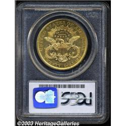 1885 $20 AU58 PCGS. With only 751 business strikes produced, the 1885 has the second lowest mintage figure of any Type Three double eagle, second only to the 1882. Only 45-55 pieces are known today. For some reason, even though most of the survivors are AU or Mint State, this was an issue that was handled roughly and most of the pieces known are heavily abraded. The fields are bright and prooflike, as always seen, without the crinkly "orange peel" texture found on proofs of this date and many gold proofs of this era. To further distinguish this piece from an impaired proof, note the notch in the truncation of Liberty's neck just left of the 5 in the date, the date is also a bit lower in the exergual area than on a proof, and the left line of the sixth pale gule on the reverse is thin. Sharply struck throughout, again as always seen, the short life of the dies used never had a chance to wear down and the highpoint detail is crisp on each side. The lovely orange-gold surfaces show a light but noticeable accent of reddish patina on both obverse and reverse, and close examination reveals there are faint traces of lilac intermixed also. The surfaces are densely populated with small abrasions; however, the only noticeable or mentionable ones that could be used for pedigree purposes are a couple of shallow vertical marks below Liberty's eye. Because of the above average appearance of this coin's surfaces it might be considered a lower Condition Census piece for this date. Population: 5 in 58, 5 finer (10/03). Important notice: Heritage usually auctions material at the rate of 200-250 lots per hour. On some occasions eBay Live bid software or the Internet may not be able to keep up with the pace of the auction. We recommend placing a realistic absentee bid now as insurance to avoid disappointment. Occasionally the auctioneer may eliminate or reject an eBay Live bid, and the auctioneer may also reopen a lot after the close of the eBay live bidding (usually because we missed an audience bid), and may reject your bid even if it shows you as the winning bidder. By bidding via eBay Live, you agree that Heritage may award the lot to another bidder at its sole discretion under the circumstances described above or any other reasonable circumstances. Also please note that all Heritage lots purchased through eBay Live carry a 20% Buyer's Premium. Please make sure you read the Terms and Conditions before you bid.