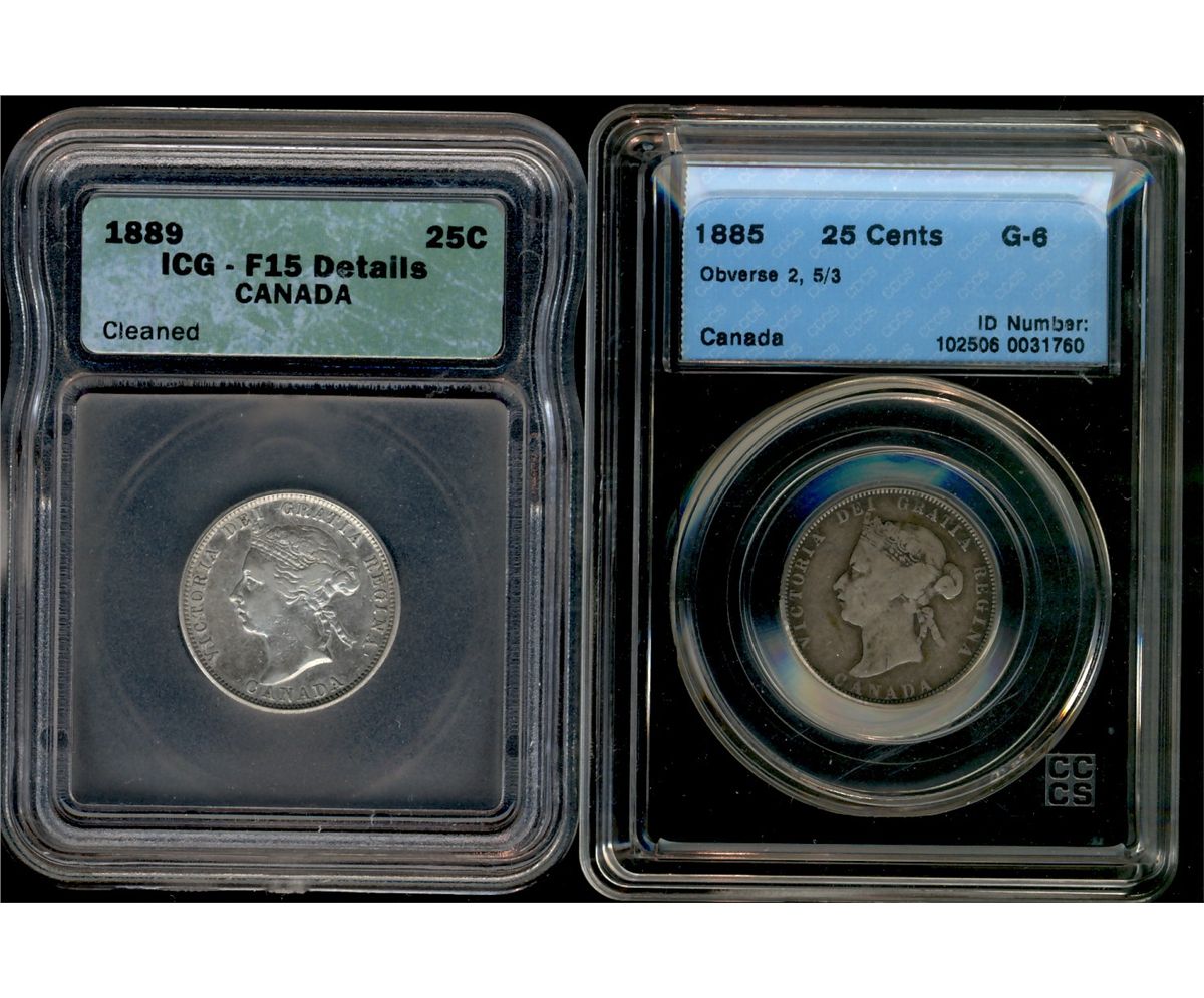 1885 25¢ Obv 2 CCCS G6 & 1889 ICG F15 Details. Lot of 2 better with 1889 detailed as cleaned. Cat $950.
