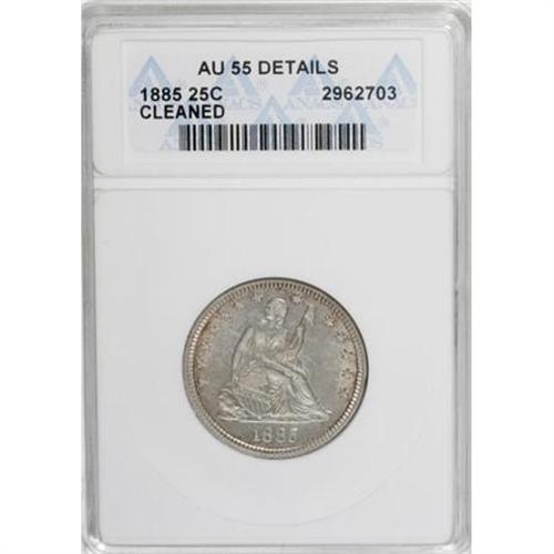 <B>1885 25C --Cleaned--ANACS. AU55 Details.</B></I> NGC Census: (2/70). PCGS Population (1/96). Mintage: 13,600. Numismedia Wsl. Price for NGC/PCGS coin in AU55: $370. (#5517)<BR><BR><B>Coin Engraver:</B> Christian Gobrecht<BR><BR><b>Shipping:</b> Coins & Currency (<a target="_blank" href="http://www.heritageauctions.com/common/shipping.php">view shipping information</a>\)