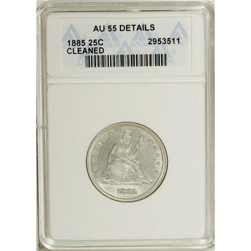 <B>1885 25C --Cleaned--ANACS. AU55 Details.</B></I> NGC Census: (2/69). PCGS Population (1/93). Mintage: 13,600. Numismedia Wsl. Price: $370. (#5517)<BR><BR><b>Shipping:</b> Coins & Currency (<a target="_blank" href="http://www.heritageauctions.com/common/shipping.php">view shipping information</a>)