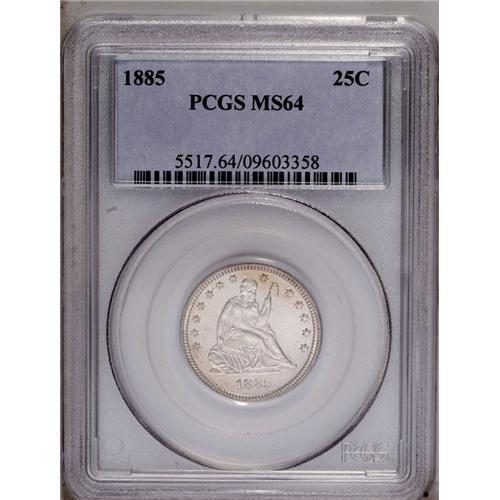 <B>1885<25C> MS64 PCGS.</B></I> Faintly toned in pale-peach shades with a generally untoned appearance overall. The rich endowment of mint frost and sharply struck devices are indicative of this low mintage (13,600 pieces) issue. Population: 16 in 64, 27 finer (2/06).