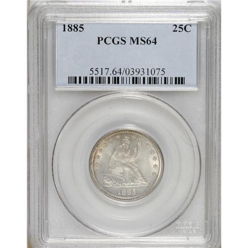 <B>1885 25C MS64 PCGS.</B></I> This lightly toned and lustrous Choice Seated quarter has pleasantly smooth surfaces, and the strike is precise aside from the right side stars. A scant 13,600 pieces were struck. Population: 16 in 64, 29 finer (2/07).<BR><BR><b>Shipping:</b> Coins & Currency (<a target="_blank" href="http://www.heritageauctions.com/common/shipping.php">view shipping information</a>)