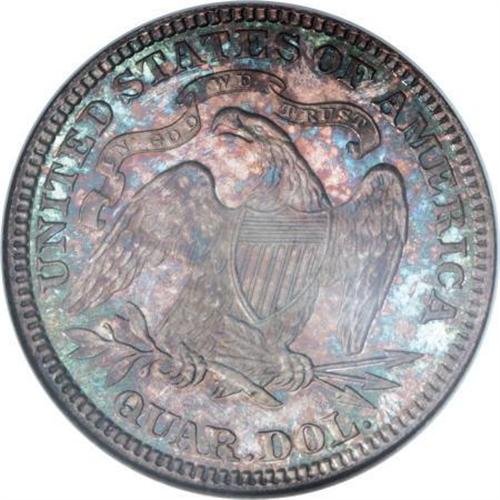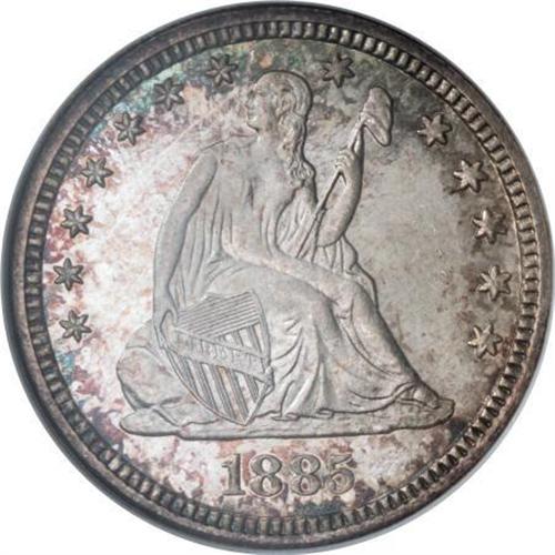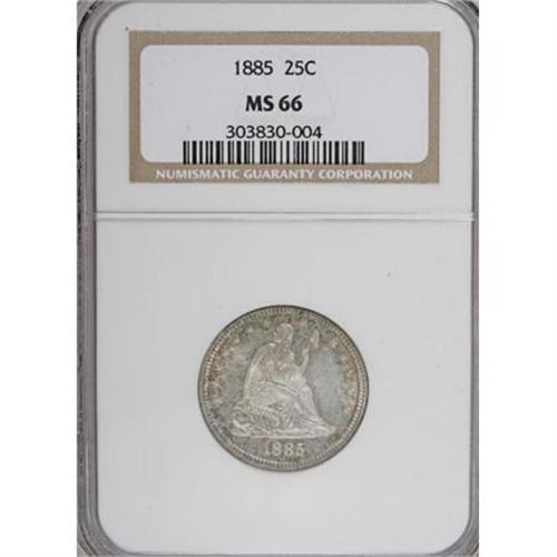 <B>1885 25C MS66 NGC.</B></I> The obverse is only partly toned in peach, violet, and sea-green freckles, while the reverse is fully patinated in similar shades. The fields are semi-prooflike and somewhat flashy. Well struck and beautifully preserved. As is the case with all quarters struck between 1879 and 1887, the 1885 has a very low mintage; just 13,600 pieces were struck. Census: 9 in 66, 9 finer (11/07). <BR><BR><B>Coin Engraver:</B> Christian Gobrecht<BR><BR><b>Shipping:</b> Coins & Currency (<a target="_blank" href="http://www.heritageauctions.com/common/shipping.php">view shipping information</a>)