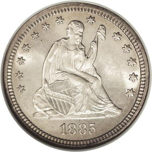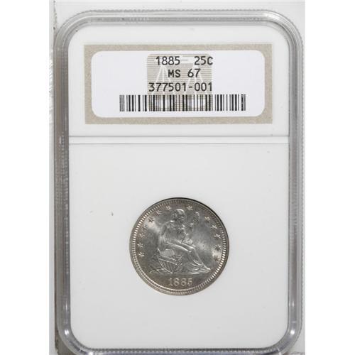 <B>1885<25C> MS67 NGC.</B></I> Quarter dollars struck throughout the 1880s are usually only seen in proof quality, with business strikes being encountered only occasionally. Such pieces in Superb Gem quality are extremely rare. This is just such a coin, as the NGC Census data indicates. It is sharply struck and both sides are fully brilliant with only a trace of pale champagne toning. The fields are reflective, and contrast nicely with the lustrous devices. Census: 8 in 67, 1 finer (9/06).