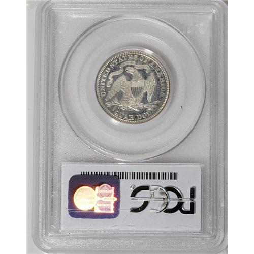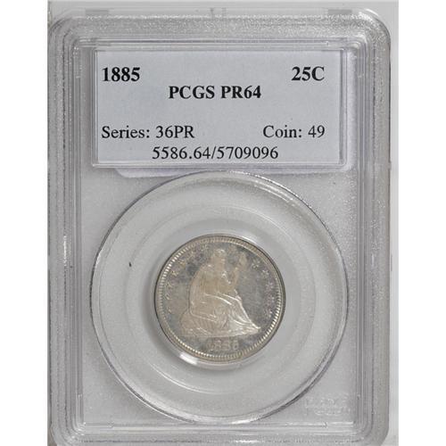 <B>1885<25C> PR64 PCGS.</B></I> Milky russet toning covers much of the obverse, but the rest of the fields, patinated ice-blue, have deep reflectivity. A nice specimen kept from the Gem category by some faint obverse hairlines.