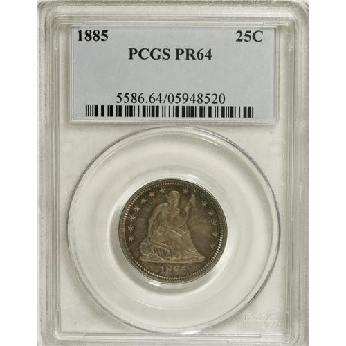 <B>1885 25C PR64 PCGS.</B></I> The 2007 <I>Guide Book</B></I> indicates 930 proof quarters were struck in 1885. This PR64 specimen displays iridescent cobalt-blue peripheral toning that frames medium intensity golden-brown and lavender coloration. Razor-sharp definition is apparent on the design elements. A few faint obverse hairlines are noted, as are some light circular marks in the right obverse field. Population: 81 in 64, 51 finer (2/07).<BR><BR><b>Shipping:</b> Coins & Currency (<a target="_blank" href="http://www.heritageauctions.com/common/shipping.php">view shipping information</a>)