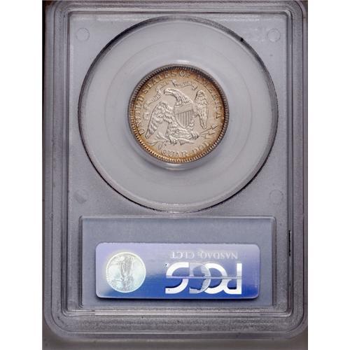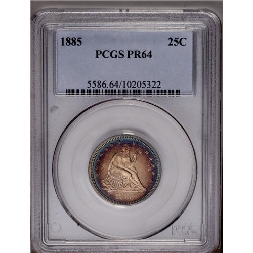 <B>1885<25C> PR64 PCGS.</B></I> This piece would likely merit a Cameo designation were it not for attractive peach toning across the obverse field and the Seated Liberty. Slender bands of electric-blue and plum adorn the obverse margin, while the reverse is brilliant save for peripheral honey toning. A low mintage date.