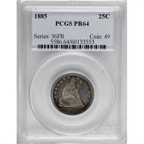 <B>1885 25C PR64 PCGS.</B></I> The design elements are generally sharp, except for the top of Liberty's head and some of the obverse stars. A dense layer of charcoal-green toning covers the reverse, while the obverse shows a mixture of variegated colors. A popular, low total mintage date. <BR><BR><b>Shipping:</b> Coins & Currency (<a target="_blank" href="http://www.heritageauctions.com/common/shipping.php">view shipping information</a>)