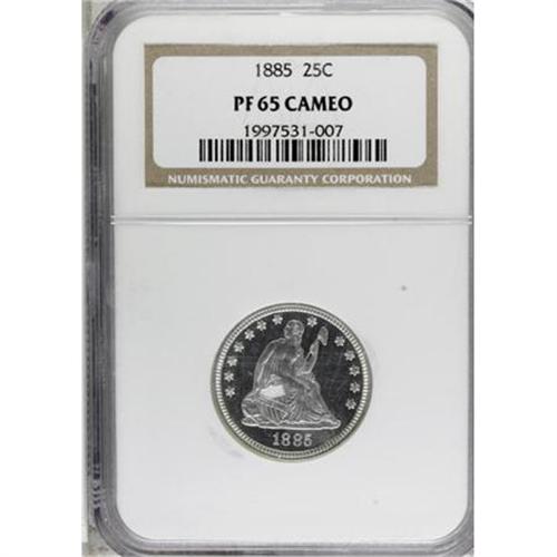 <B>1885 25C PR65 Cameo NGC.</B></I> This splendid Gem exhibits brilliant silver surfaces with tending toward pale ice blue. Both sides have deeply mirrored fields to frame the lustrous silvery-white devices. Although the last two stars are a trifle flat, the remaining details on both sides are fully defined. While they are not rare in proof, the quarter dollars of the 1880s are rarities in Mint State grades, thus the proof coins are subject to extra demand. Census: 17 in 65 Cameo, 19 finer (6/07).<BR><BR><b>Shipping:</b> Coins & Currency (<a target="_blank" href="http://www.heritageauctions.com/common/shipping.php">view shipping information</a>)