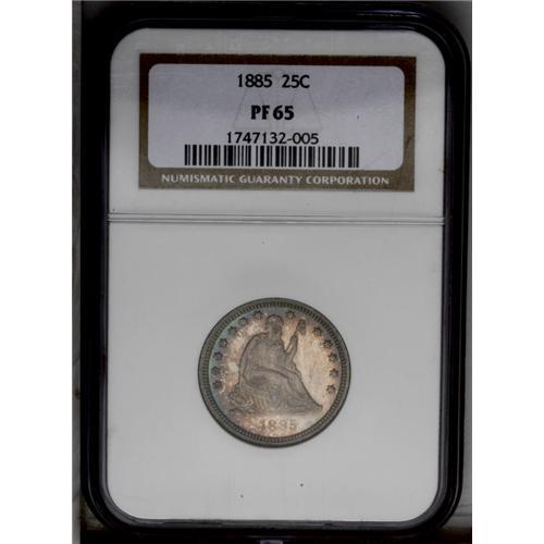 <B>1885<25C> PR65 NGC.</B></I> A well mirrored specimen cloaked in golden-gray patina, with flashes of bright multicolored iridescence at the borders. Several small, lighter colored areas on the obverse camouflage old spots. Census: 34 in 65, 38 finer (3/06).