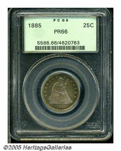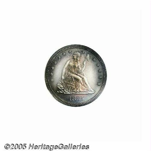 <B>1885<25C> PR66 PCGS.</B></I> Toning enthusiasts will certainly appreciate this colorful Gem. The obverse is draped in mixed copper-red and cobalt-blue shades with lime-golden tones at the border. The reverse, on the other hand, exhibits an almost complete coating of turquoise-blue with lime-gold accents at the outermost regions. A fully struck and pristine survivor of this low mintage Seated Quarter. Population: 19 in 66, 4 finer (5/05).