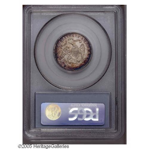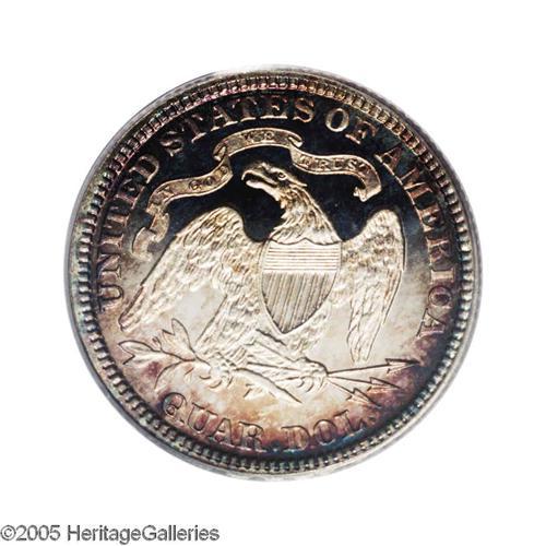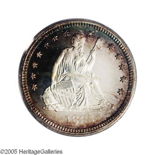 <B>1885<25C> PR67 Cameo PCGS.</B></I> Mauve-red and sea-green colors dominate the peripheries, while the centers remain brilliant. This intricately struck Superb Gem possesses seamless mirrored fields and icy devices. Only minute contact on the Seated Liberty denies perfection. Population: 4 in 67, 0 finer (10/05).